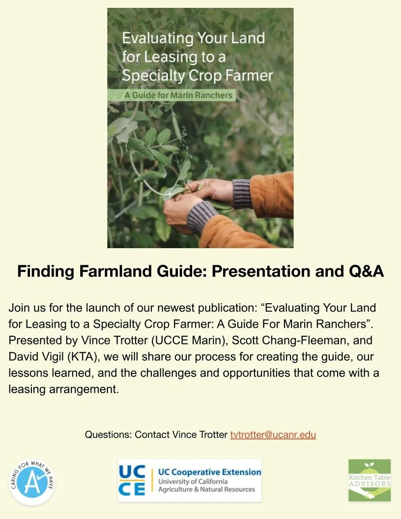 Learn more about the guide, land challenges and opportunities in Marin, and the larger Finding Project in these upcoming webinars hosted by UCCE Marin and Kitchen Table Advisors.